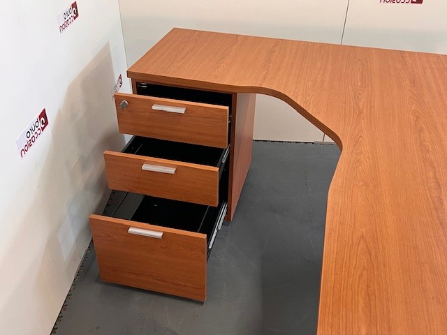 Son plateau en mélaminé coloris hêtre apporte une touche chaude et naturelle à votre espace. Le mélaminé est reconnu pour sa résistance aux rayures, aux tâches et à l’usure quotidienne, garantissant une longue durée d’utilisation — un atout essentiel pour un bureau d’occasion professionnel.
