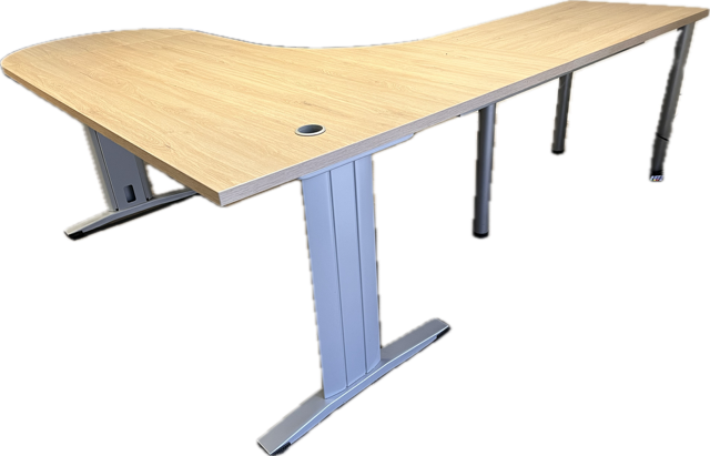 Les pieds métal techniques en L finition aluminium assurent une excellente stabilité et une grande durabilité dans le temps. Le plateau mélaminé coloris chêne clair apporte une touche chaleureuse et moderne, facile à intégrer dans tout type d’environnement de bureau : open space, bureau de direction ou télétravail.