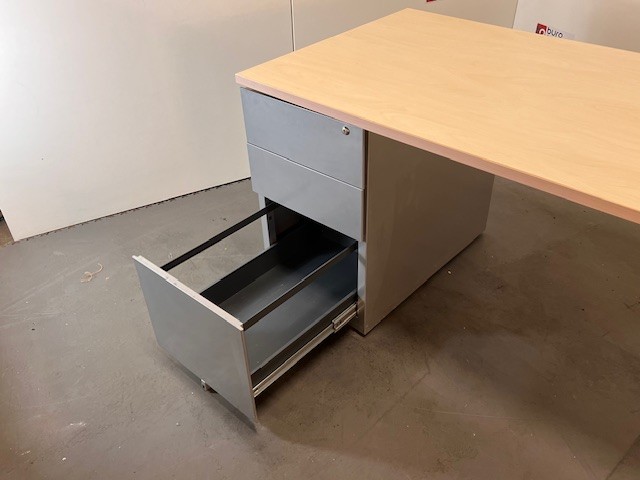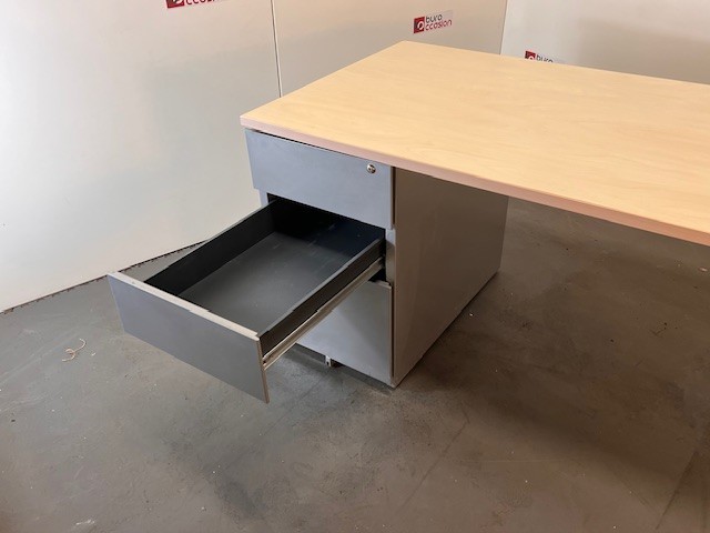 Grâce à son caisson intégré, ce bureau permet de garder vos essentiels à portée de main tout en libérant l’espace de travail. Les deux tiroirs plats sont parfaits pour les fournitures de bureau, tandis que le grand tiroir offre un espace de rangement plus généreux pour dossiers et archives 📁.
